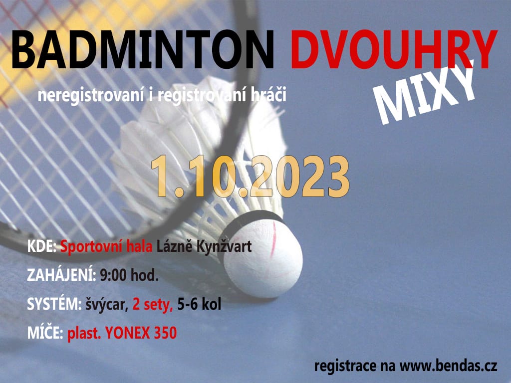 Badmintonový oddíl TJ Sokol Lázně Kynžvart pořádá Šestnáctého lázeňského šviháka badmintonový turnaj singlů mužů, singlů žen a mixů.