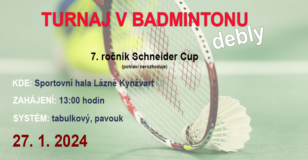 Badminton Lázně Kynžvart pořádá Memoriál Martina Schneidera VII. ročník Schneider Cup badmintonový turnaj čtyřher bez omezení pohlaví.