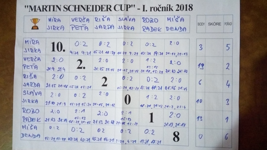 V duchu vzpomínek na našeho dlouholetého badmintonového i životního kamaráda Martina Schneidera, který nečekaně skonal vloni v únoru, jsme 10. 2. 2018 uspořádali na jeho počest turnaj čtyřher – I. ročník Martin Schneider Cupu. Turnaje se zúčastnilo 6 párů, všichni aktivní hráči z Lázní Kynžvartu ve složení Kucharik R./Štěpán R., Tomeš S./Šipan J., Bucher R./Prokeš J., Placek P./Placková V., Kucharik D./Prokeš M. a naši badmintonoví přátelé Čipera M./Touš J. (Plánice/Benešov), kteří Martina moc dobře znali a také chtěli zavzpomínat.