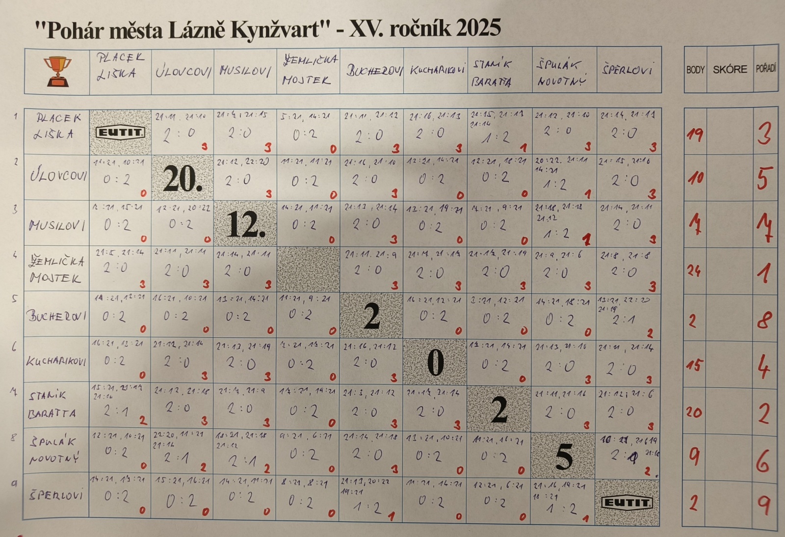 Poděkování patří všem hráčům za účast, pořadatelům za bezproblémový průběh turnaje a městu Lázně Kynžvart za dlouhodobou podporu sportovních aktivit, věcné ceny vítězům předával místostarosta Adam Gabriel.