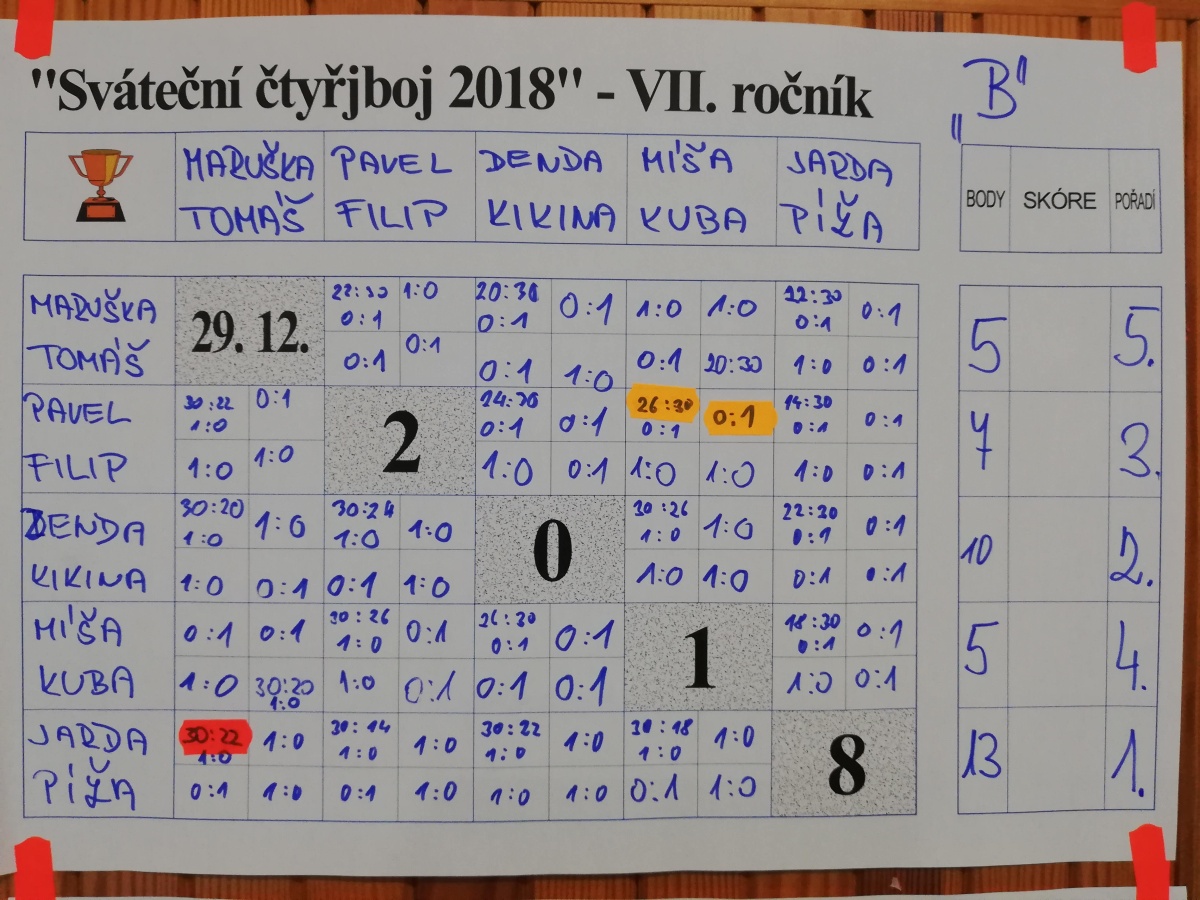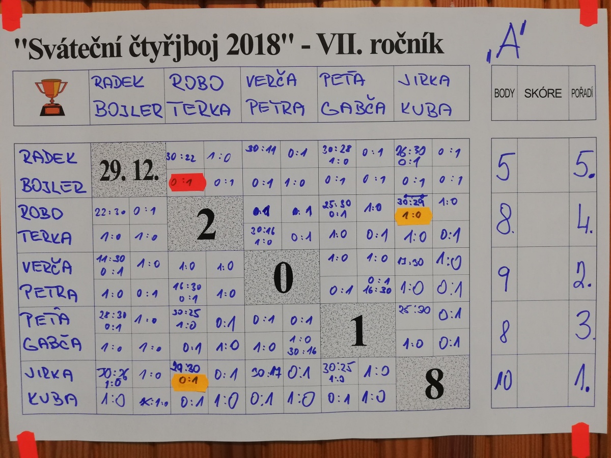 V tělocvičně Základní školy Lázně Kynžvart se v sobotu 29.12.2018 konal již VII. ročník Svátečního čtyřboje dvojic – sportovního klání v oblíbených disciplínách – badmintonu, elektronických šipkách, kostkách a karetní hře Prší.
