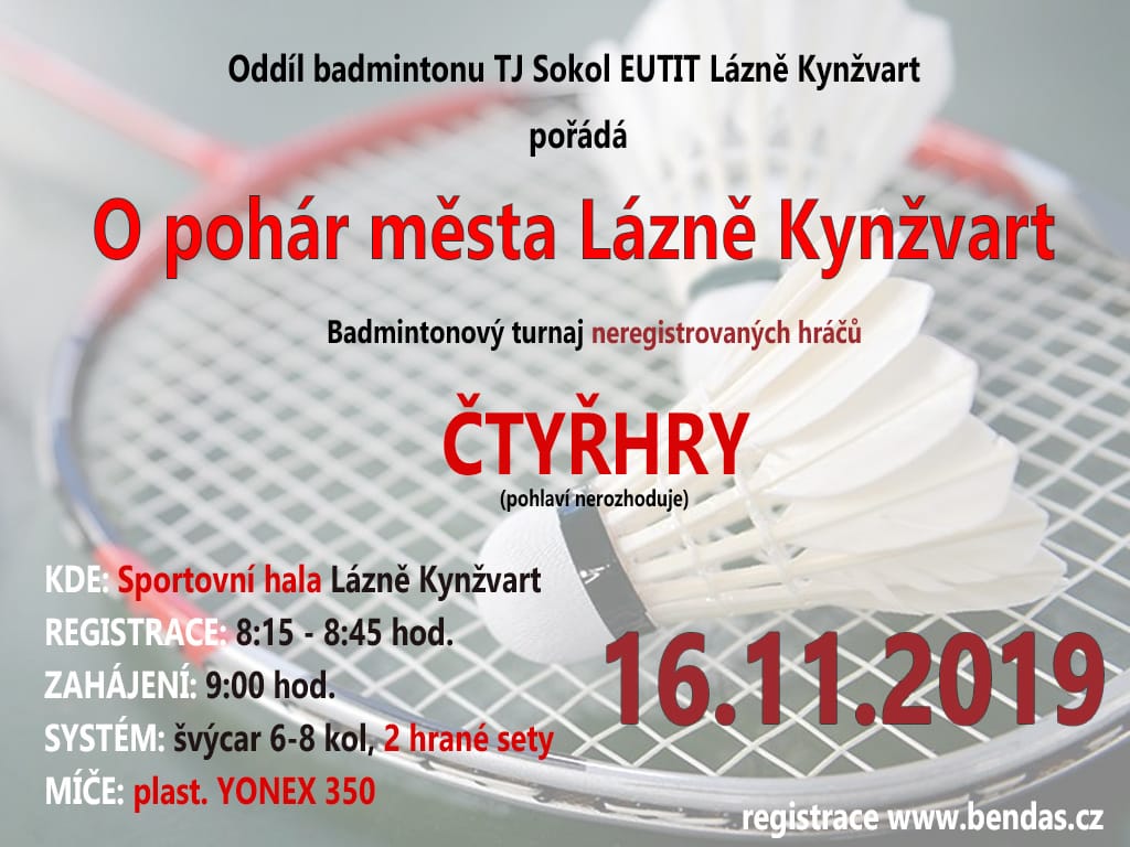 Badmintonový oddíl TJ Sokol Lázně Kynžvart pořádá XI. ročník O pohár města Lázně Kynžvart badmintonový turnaj čtyřher