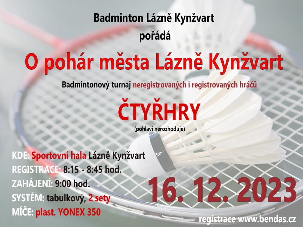 Badminton Lázně Kynžvart pořádá XIII. ročník O pohár města Lázně Kynžvart badmintonový turnaj čtyřher bez rozdílu pohlaví