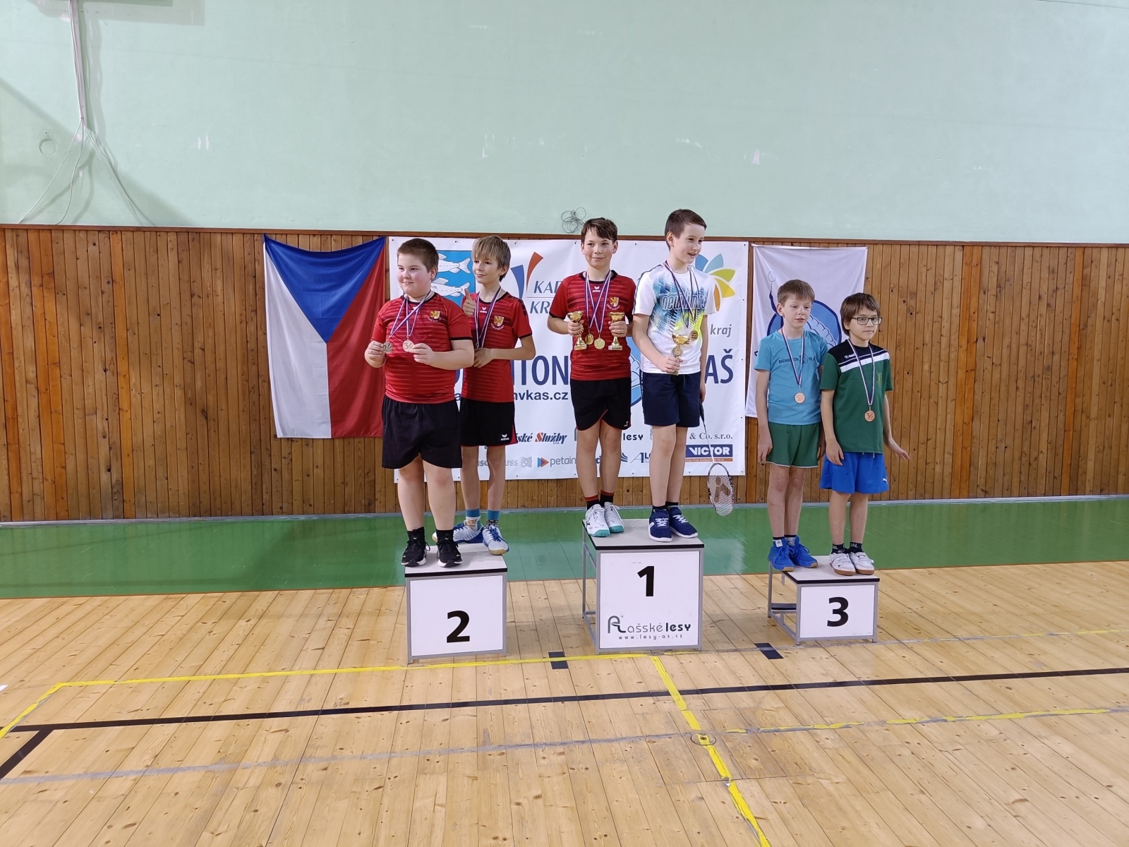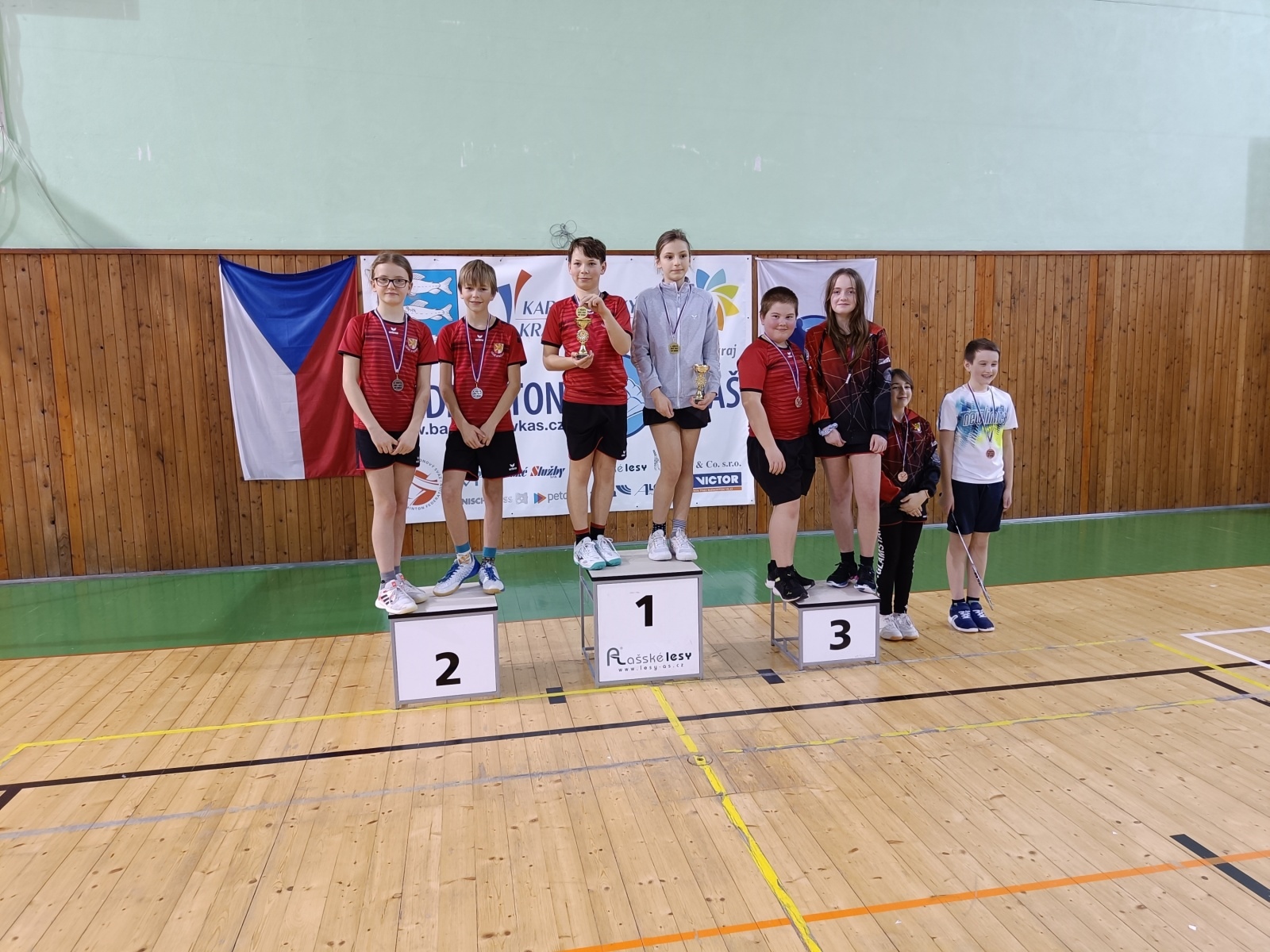 Vzhledem k malému počtu dívek na turnaji bylo možné sestavit pouze 4 mixy. Zde jsme měli jistotu všech tří medailí, poněvadž naše děti figurovaly ve všech dvojicích. Bylo jen otázkou, kdo kterou medaili získá. Kuba si zahrál se svou stálejší kolegyní Stelou Kuntovou z Aše, Niki se díky ochoření Gabriely Kovandové spojil s Terkou, Dan s Elenou už jsou stálou dvojicí a Štěpa spojila síly s Adamem Keresztesem z Aše. Vzhledem k počtu dvojic se hrálo tabulkovým systémem „každý s každým“. Na čtvrtém místě se umístila Štěpánka s Adamem, kteří sice nestačili na ostatní dvojice, ale předvedli slušné výkony a pěkné bodové zisky. Dan s Elenkou mohli pomýšlet i na lepší než bronzovou pozici, když ve druhém setu nadělili svým soupeřům 18 a 19 bodů. O zlato si zahráli velmi napínavým utkáním na tři sety Kuba se Stelou a Niki s Terkou. Třetí set vyšel lépe prvním jmenovaným a mohli se tak radovat ze zlatých pohárů pro vítěze disciplíny.